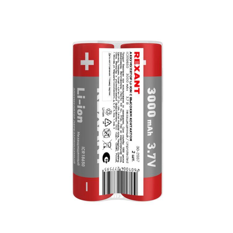 Аккумулятор Li-ion (литий-ион) 18650 3.7В 3000мАч без платы защиты (уп.2шт) Rexant 30-2037