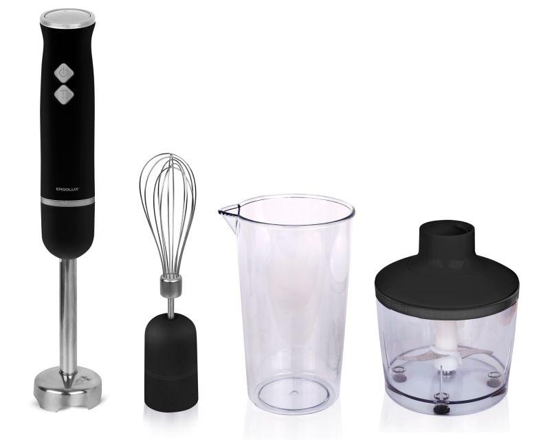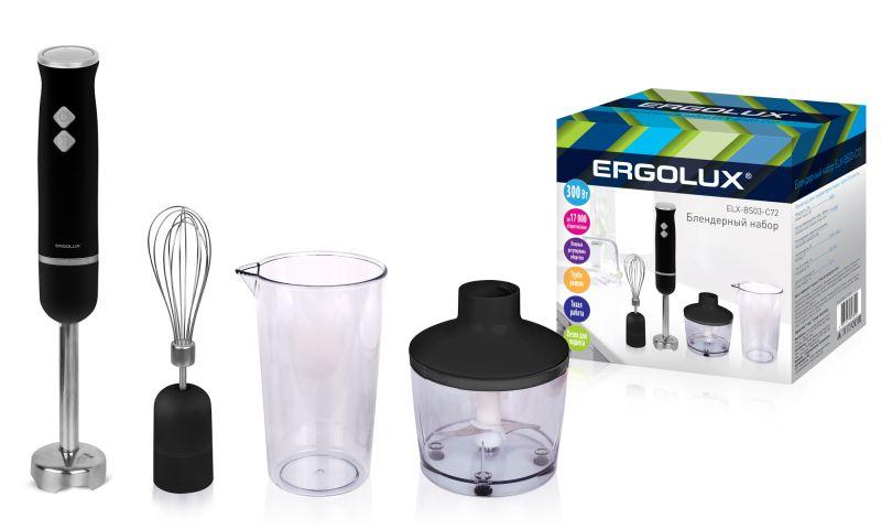 Блендер ELX-BS03-C72 в наборе: измельчитель; мерн. стакан; венчик; блендер 300Вт 220-240В серебр./черн. Ergolux 14726