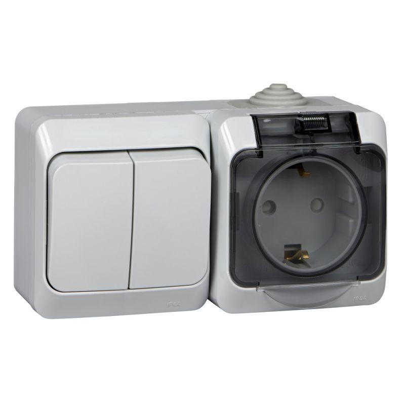 Блок ОП Этюд (розетка 16А 250В евростандарт с заземл. защ. шторки + 2-кл. выкл.) IP44 сер. SE BPA16-242C