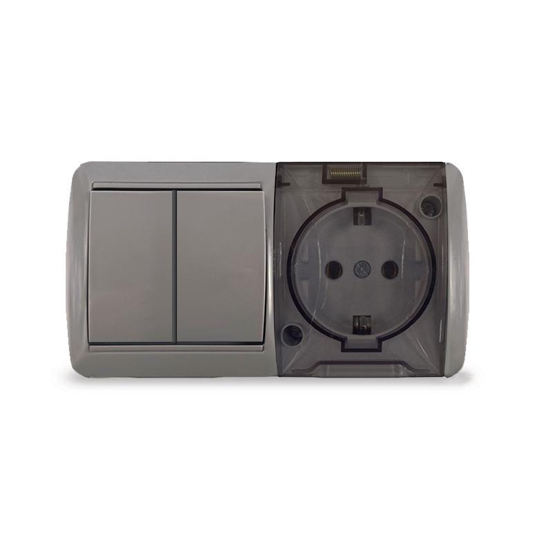 Блок ОП Клио 2-кл. выкл. 10А + розетка 1-м 16А 250В с заземл. с прозр. крышкой сер. Universal К2239-Gr