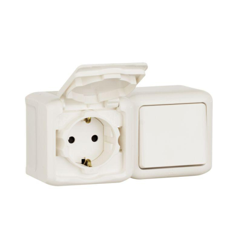 782318 | Блок ОП выключатель + розетка с заземл. защ. шторки IP44 Quteo бел. Leg