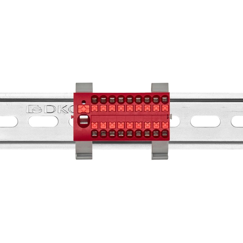 DTP1-118-104SPUR-H | Блок распределительный с горизонт. адаптером на рейку шир. 35мм зажим push-in 1 ввод 6кв.мм 18 точек подключения 2.5кв.мм красн. DKC