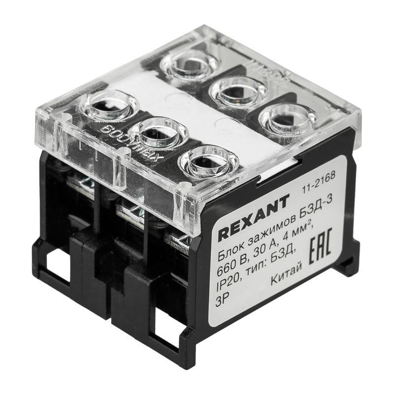 11-2168 | Блок зажимов клеммный БЗД 3х-полюсный 4.0кв.мм 30А на DIN-рейку Rexant