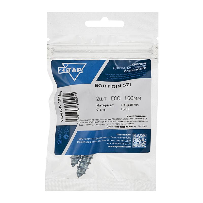 103881 | Болт сантехнический 10х60 DIN 571 оцинк. (уп.2шт) Tech-Krep/Zitar