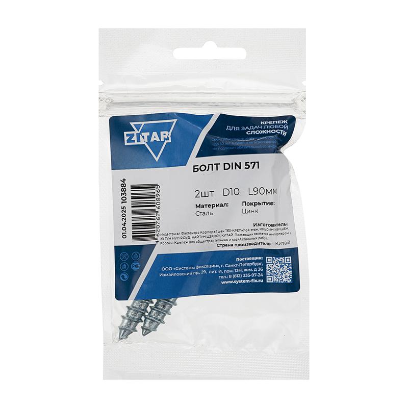 103884 | Болт сантехнический 10х90 DIN 571 оцинк. (уп.2шт) Tech-Krep/Zitar