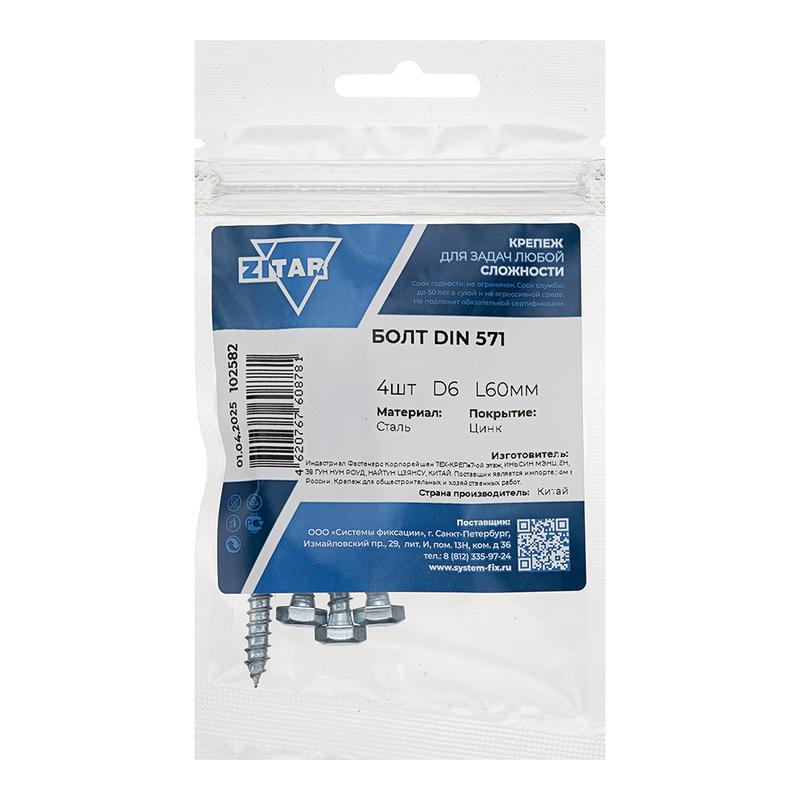 102582 | Болт сантехнический 6х60 DIN 571 оцинк. (уп.4шт) Tech-Krep/Zitar