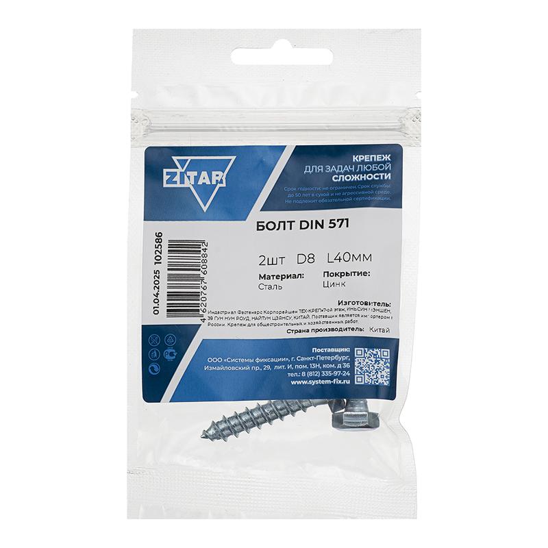 102586 | Болт сантехнический 8х40 DIN 571 оцинк. (уп.2шт) Tech-Krep/Zitar