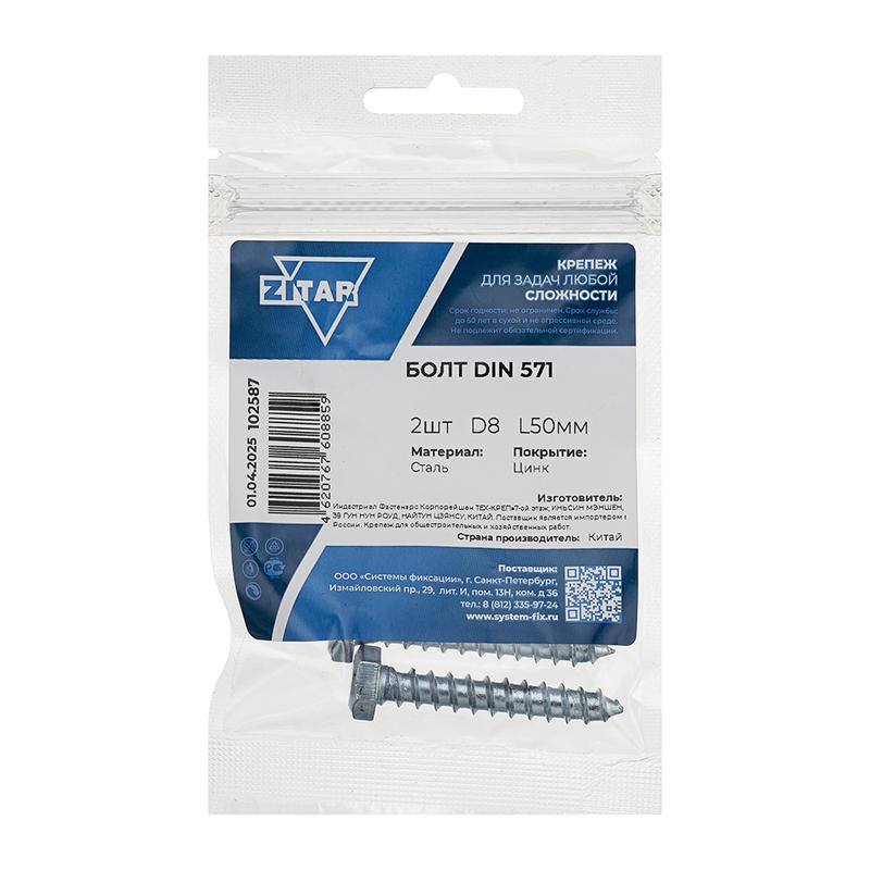 102587 | Болт сантехнический 8х50 DIN 571 оцинк. (уп.2шт) Tech-Krep/Zitar
