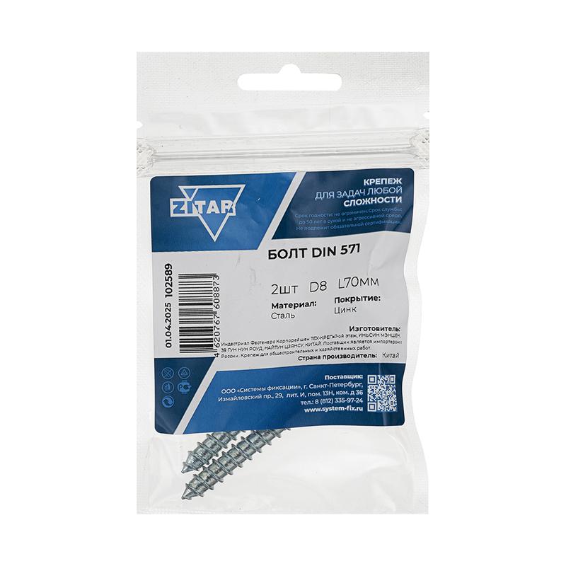102589 | Болт сантехнический 8х70 DIN 571 оцинк. (уп.2шт) Tech-Krep/Zitar