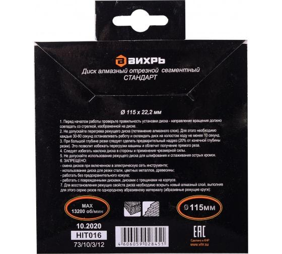 Товар Диск алмазный отрезной сегментный СТАНДАРТ 115х22.2мм сухая резка Вихрь 73/10/3/12 доступен с доставкой по г. Санкт-Петербург, Ленинградской области и территории РФ, или самовывозом.