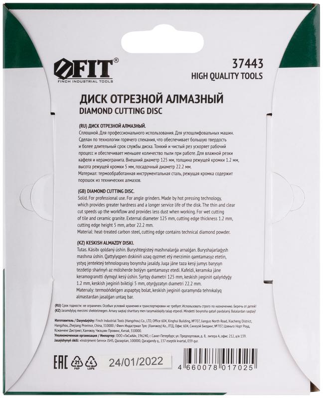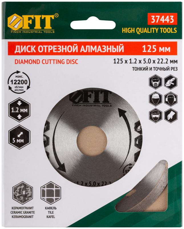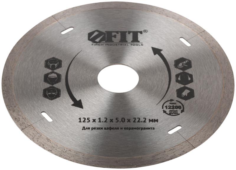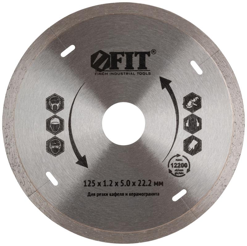 Диск отрезной алмазный сплошной (влажная резка) для работы с кафелем 125х1.2х5.0х22.2мм FIT 37443