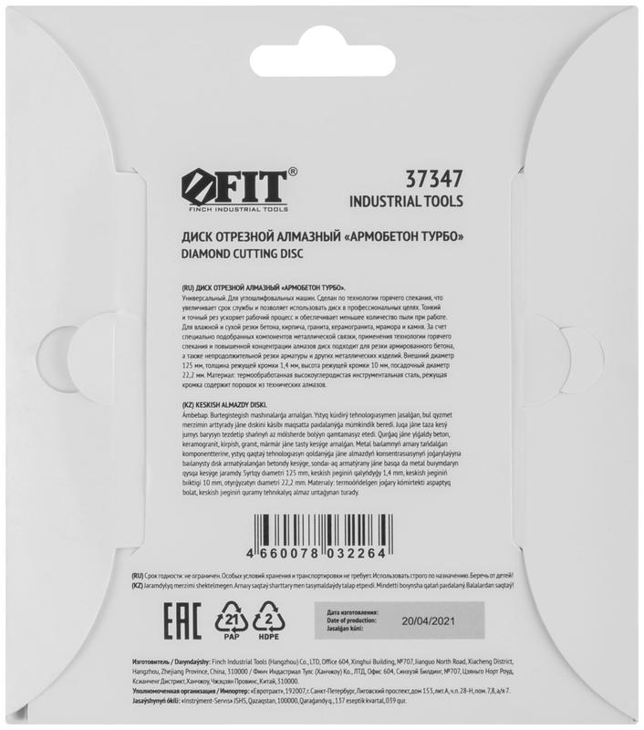 Диск отрезной алмазный универсальный "Армобетон турбо" (сухая и влажная резка) 125х1.4х10х22.2мм FIT 37347