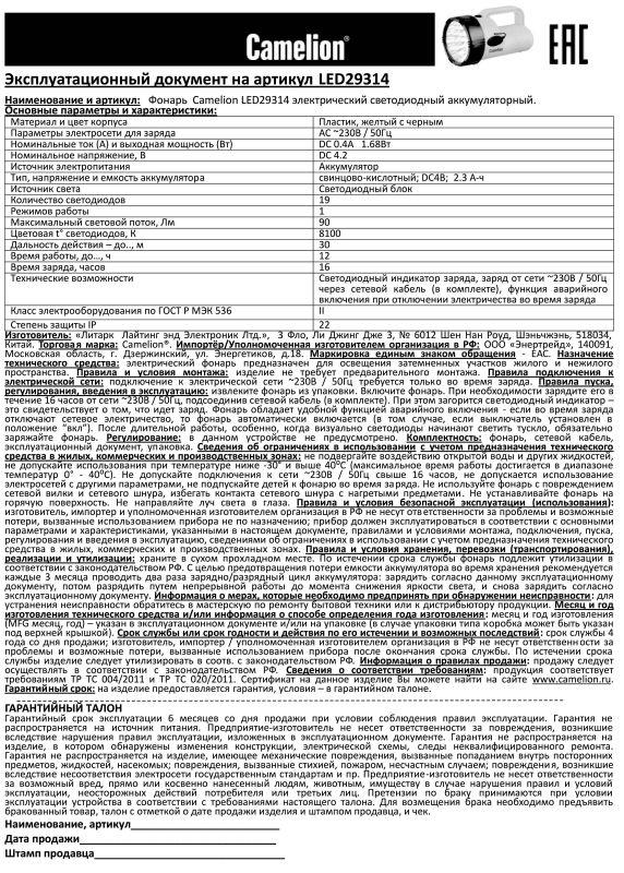 Товар Фонарь 19LED 29314 (аккум. 220В желт.; 4В 2.3А-ч) Camelion 10471 доступен с доставкой по г. Санкт-Петербург, Ленинградской области и территории РФ, или самовывозом.