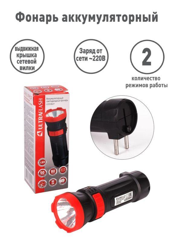 14931 | Фонарь аккумуляторный LED3849 1 LED 2 режима 220В аккум. SLA пластик черн. Ultraflash