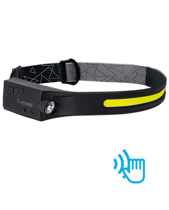 Фонарь аккумуляторный налобный сенсорный 20Вт COB LED+2ВтXPE LED Li-po 102540 1200мА.ч корпус гибкая прорезиненная основа встроенный регулируемый эласт. ремешок USB-шнур type C КОСМОС KOC504Lit
