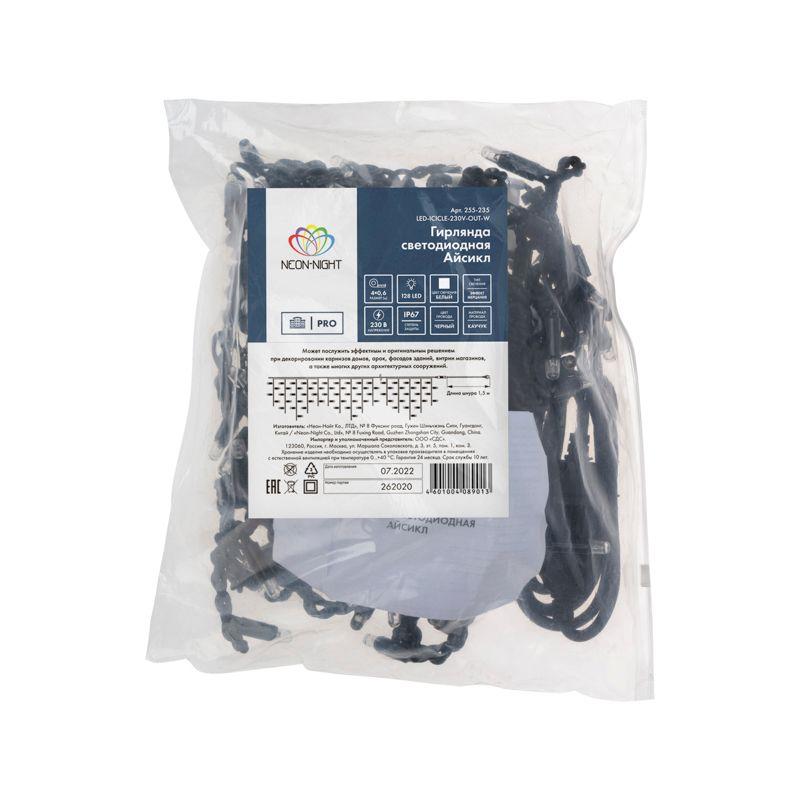 255-235 | Гирлянда светодиодная "Айсикл" (бахрома) 4х0.6м 128LED бел. 10Вт 230В IP67 эффект мерцания провод каучук черн. (нужен шнур питания 315-000) Neon-Night
