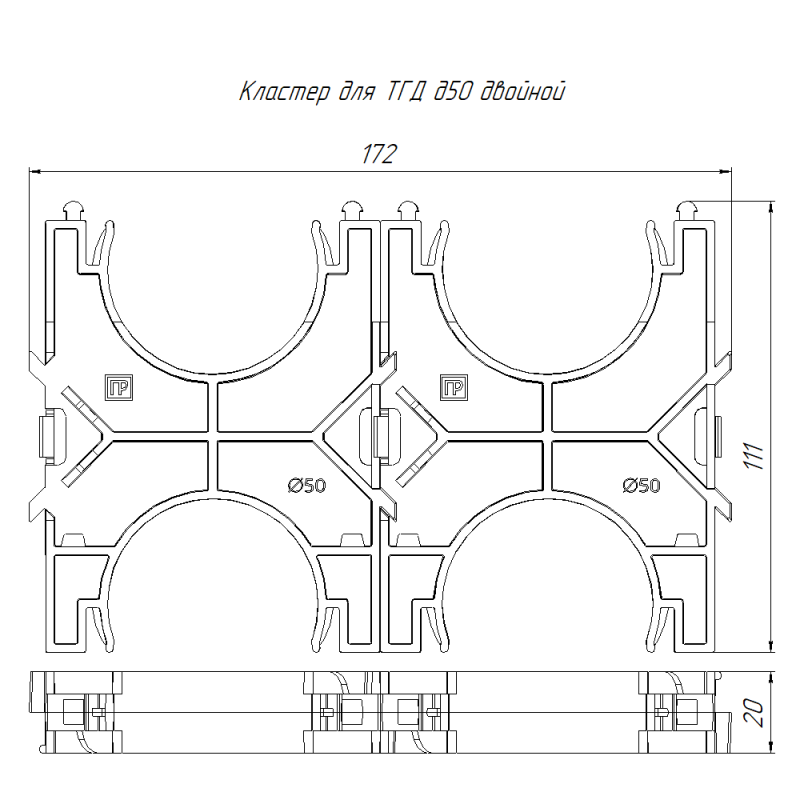 PR13.02567 | Кластер двойной двухсторонний для двустен. труб d50мм Промрукав