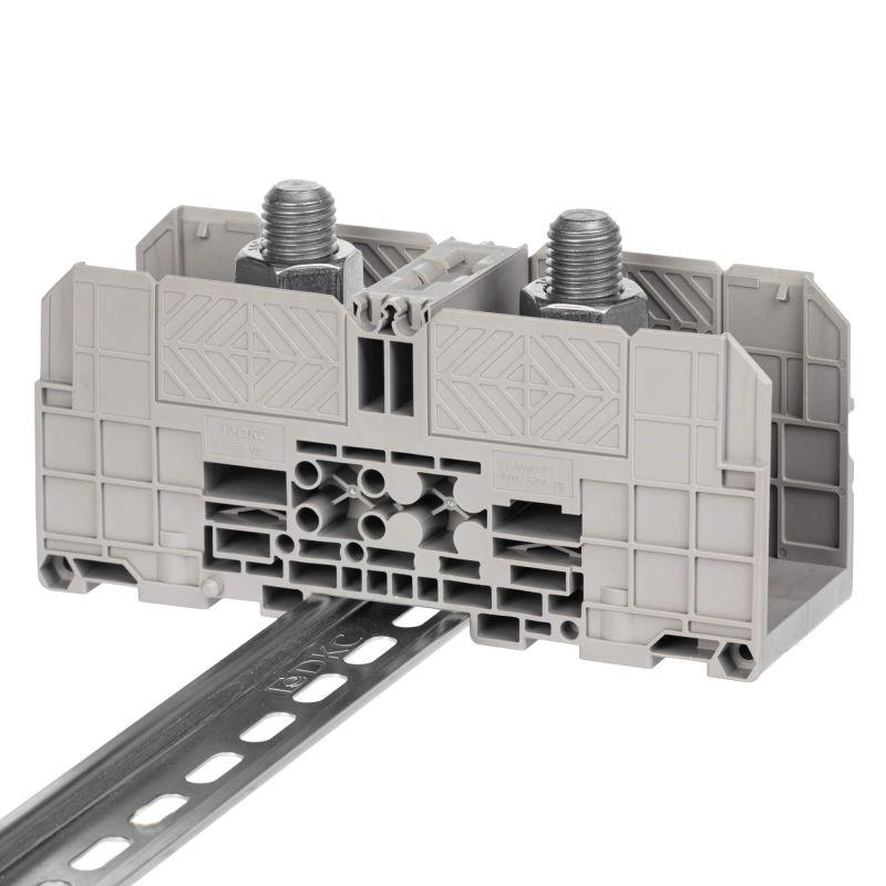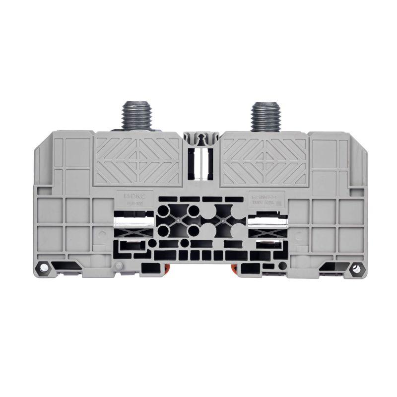 Серый цвет, 2 точки подключения, 300 мм2. Монтаж перемычек на шпильку клеммы. Габариты (В?Ш?Г) 86?163?55 мм.