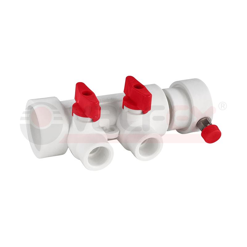 111134008R | Коллектор PPR с отсечными красн. кранами и воздух-ком 40х20 8 выходов (15/1) бел. K VALFEX