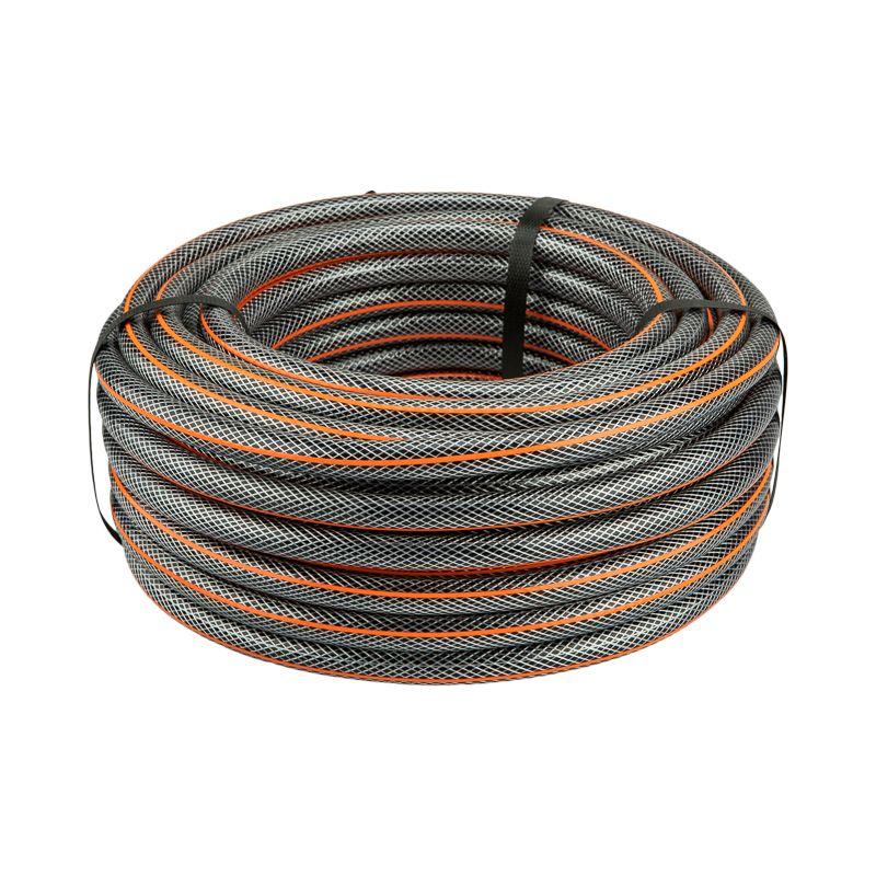 Шланг выполнен из высококачественного ПВХ. Трехслойная структура создает дополнительную прочность. Армирование придает стойкость к нагрузкам и позволяет выдерживать высокое давление воды.