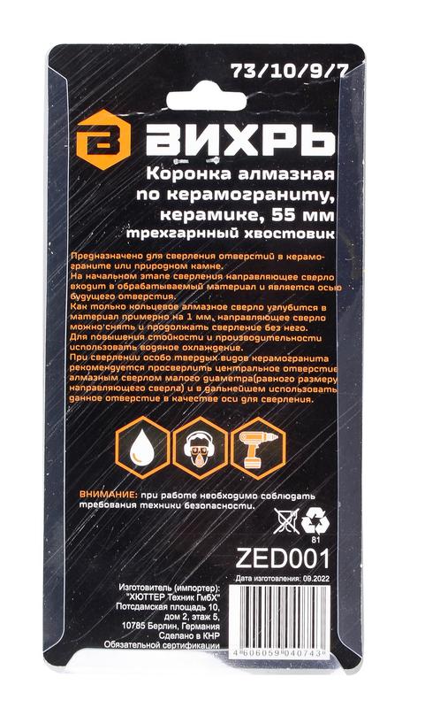 Коронка алмазная по керамограниту/керамике 55мм Вихрь 73/10/9/7