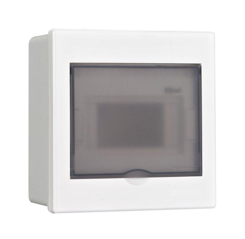 Корпус является встраиваемым, имеет 1 DIN-рейку и 6 модулей (18 мм) для установки устройств, держатель для шинок, шинки N и PE. Дверца фиксируется в верхнем положении. Щиток на 100% совместим с модульным оборудованием Dekraft и Systeme Electric.