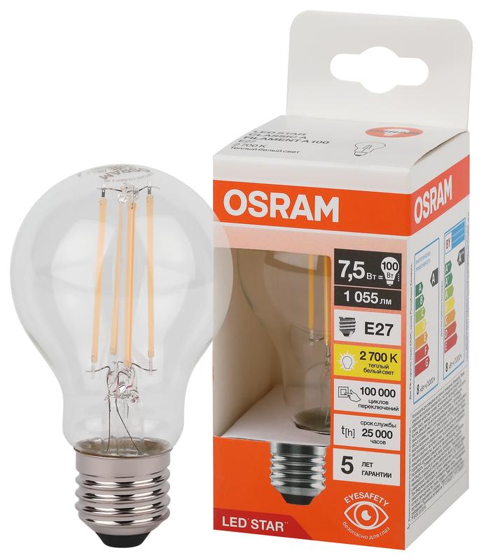 Товар Лампа светодиодная филаментная LSCLA100 7.5W/827230VFILCL 7.5Вт 2700К тепл. бел. E27 1055лм A угол пучка 300град. 220-240В (замена 100Вт) прозр. стекло OSRAM 4058075684126 доступен с доставкой по г. Санкт-Петербург, Ленинградской области и территории РФ, или самовывозом.