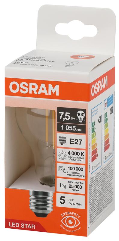 Товар Лампа светодиодная филаментная LSCLA100 7.5W/840230VFILCL 7.5Вт 4000К нейтр. бел. E27 1055лм A угол пучка 300град. 220-240В (замена 100Вт) прозр. стекло OSRAM 4058075684188 доступен с доставкой по г. Санкт-Петербург, Ленинградской области и территории РФ, или самовывозом.