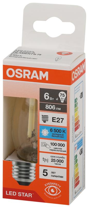 4058075688100 | Лампа светодиодная филаментная LSCLB75 6W/865 230VFILCL 6Вт 6500К холод. бел. E27 806лм B угол пучка 300град. 220-240В (замена 75Вт) прозр. стекло OSRAM