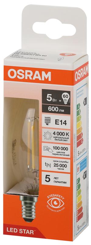 4058075684966 | Лампа светодиодная филаментная LSCLBA60 5W/840 230VFILCL 5Вт 4000К нейтр. бел. E14 600лм BA угол пучка 300град. 220-240В (замена 60Вт) прозр. стекло OSRAM