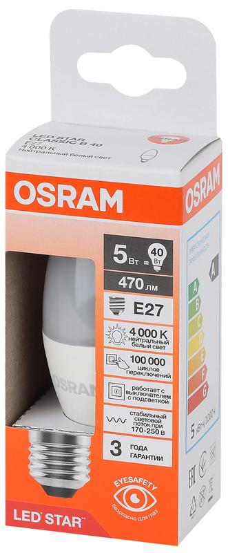 4058075696891 | Лампа светодиодная LED Star 5Вт 4000К нейтр. бел. E27 470лм B угол пучка 200град. 170-250В (замена 40Вт) матов. пластик OSRAM