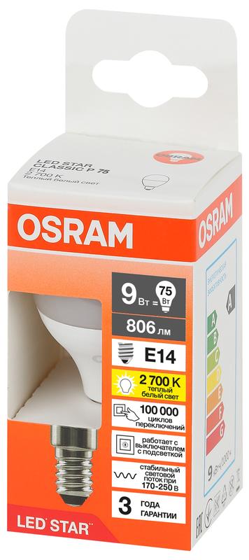 4058075696143 | Лампа светодиодная LED Star 9Вт 2700К тепл. бел. E14 806лм P угол пучка 180град. 170-250В (замена 75Вт) матов. пластик OSRAM