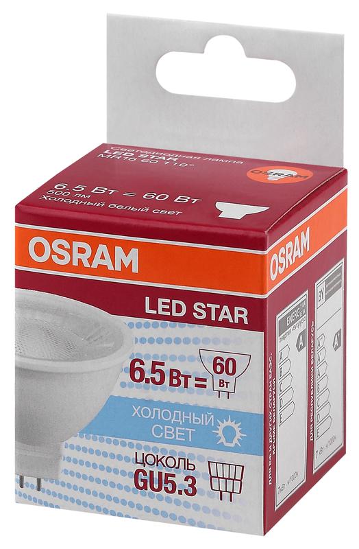 4058075481251 | Лампа светодиодная LED STAR MR16 60110 6.5W/850 230V GU5.3 520лм 6.5Вт (замена 35Вт) 5000К холод. бел. GU5.3 MR16 220-240В прозр. пласт. OSRAM