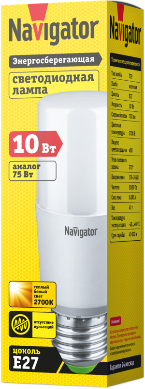 61465 | Лампа светодиодная 61 465 NLL-T39-10-230-2.7K-E27 10Вт линейная матовая 2700К тепл. бел. E27 750лм 176-264В Navigator