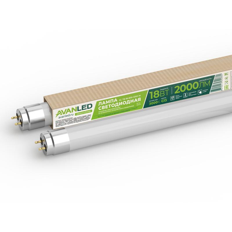 Лампа светодиодная AL T8-18-830-1200-М 18Вт матовая 3000К тепл. бел. G13 2000лм 195-265В (пр-во РФ) AVANLED 11112301