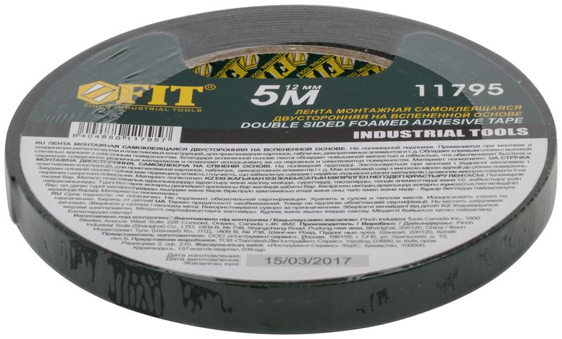 11795 | Лента клеящая 2-х сторонняя монтажная на вспененной основе с полимерной подложкой 12ммх5м FIT