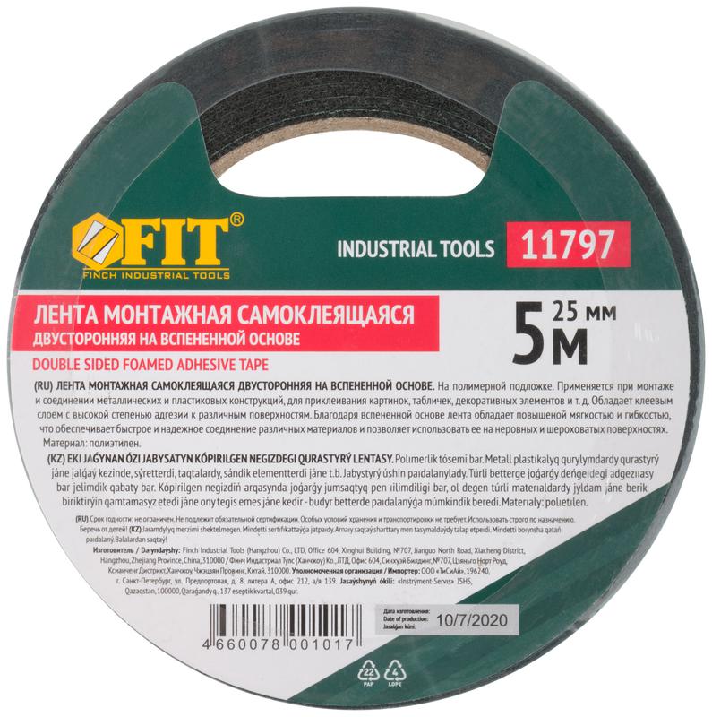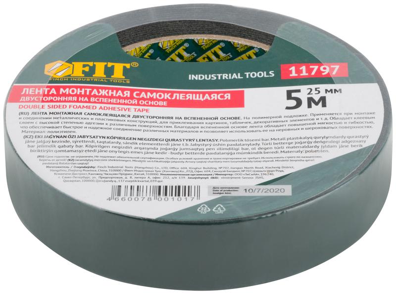11797 | Лента клеящая 2-х сторонняя монтажная на вспененной основе с полимерной подложкой 25ммх5м FIT