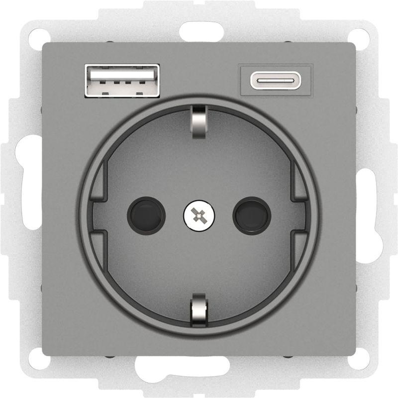Розетка силовая Systeme Electric (ранее Schneider Electric) серии AtlasDesign 16А (цвет сталь) с заземлением и шторками с розеткой USB, с двумя разъемами тип А и тип С. Розетка совмещает в себе сразу 3 функции в одном изделии. Удобное и современное решение для дома, офиса и других помещений. - Лицевые детали из качественного ABS-пластика, устойчивого к царапинам и УФ-излучению. - Заземляющий контакт обеспечивает дополнительную защиту от удара электрическим током. - Шторки обеспечивают дополнительную безопасность в доме, где находятся дети. - Одно устройство позволяет как подключить бытовые приборы, так и зарядить мобильные устройства.