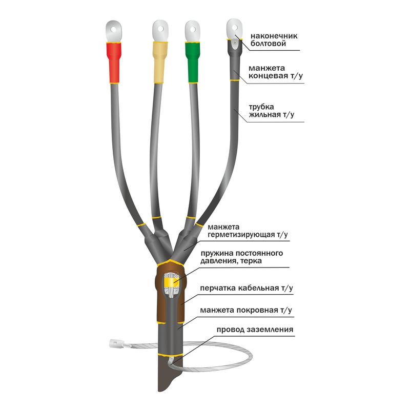 Универсальные болтовые наконечники со срывными головками, входящие в комплект кабельной муфты, подходят для кабелей как с алюминиевыми, так и с медными жилами. Комплект заземления предусматривает крепление провода заземления к бронелентам кабеля с применением роликовой пружины постоянного давления и контактной терки. Обладает необходимым уровнем устойчивости к воздействию агрессивных внешних факторов.