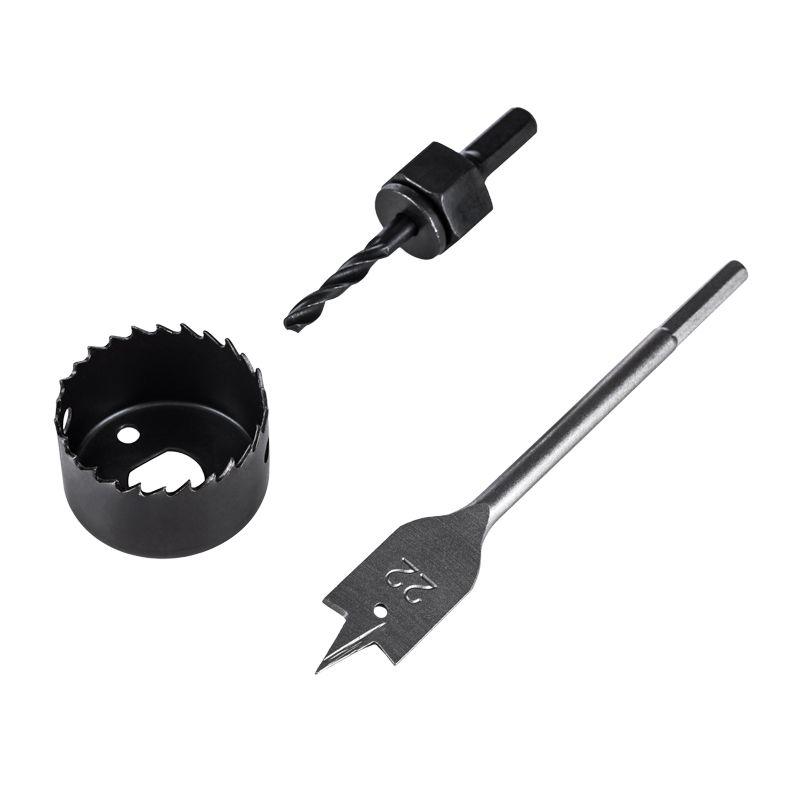 В комплектацию входят перовое сверло (22 мм), спиральное сверло (6 мм), а также кольцевая пила по дереву (48 мм).