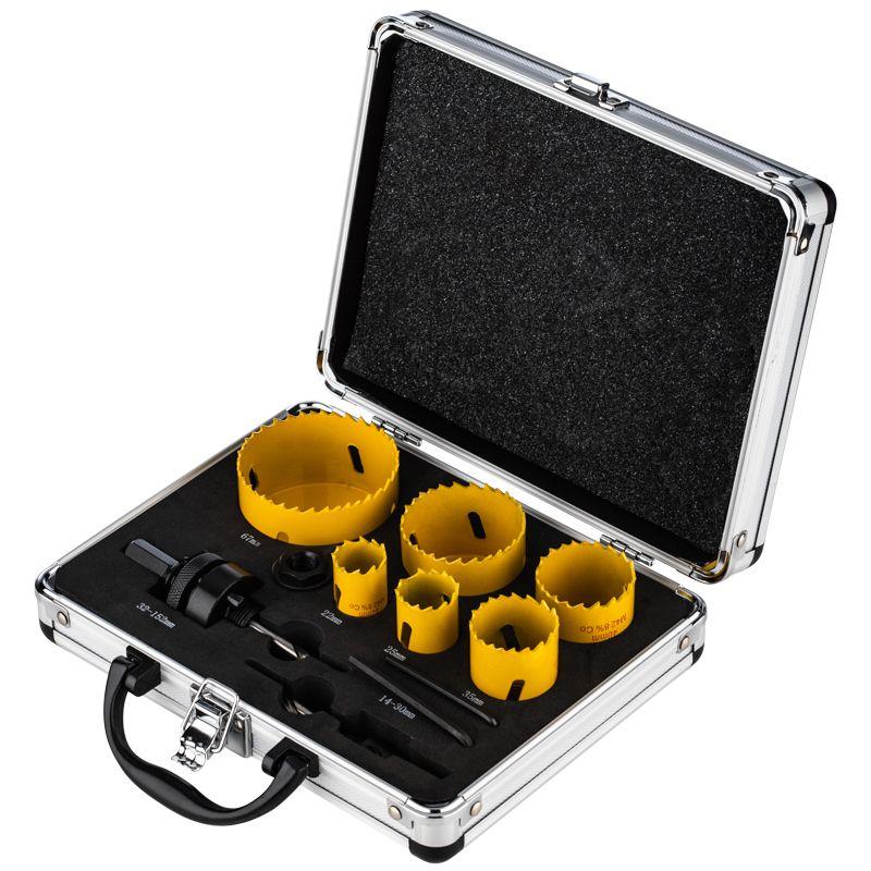 Набор поставляется в металлическим кейсе. В комплектацию входят 11 предметов: 6 коронок диаметром 22, 25, 35, 40, 51, 67 мм, 2 хвостовика для коронок, 2 шестигранных ключа, 1 адаптер.