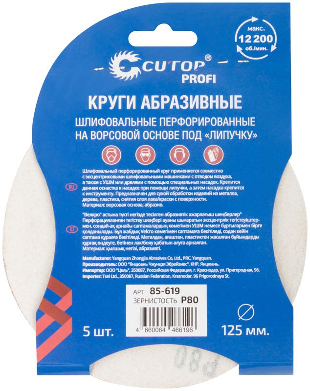 Набор кругов абразивных шлифовальных перфорированных на ворсовой основе под "липучку" Р80 125мм (уп.5шт) Profi Cutop 85-619