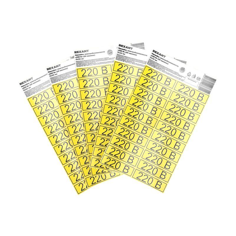 Наклейка знак электробезопасности «220 В» 15х50мм (с хедером 20шт на листе) Rexant 56-0007-01
