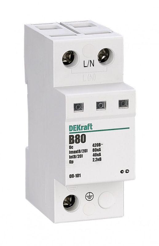 Ограничитель перенапр. ОП-101 1P 80кА B 420В DEKraft 18019DEK – монтажный элемент, электрощитовой аксессуар. Предупреждает повреждения из-за перепадов напряжения в сети, высокочастотных помех, высокой амплитуды грозовых токов. Уровень защиты - класс В (2,2 кВ).