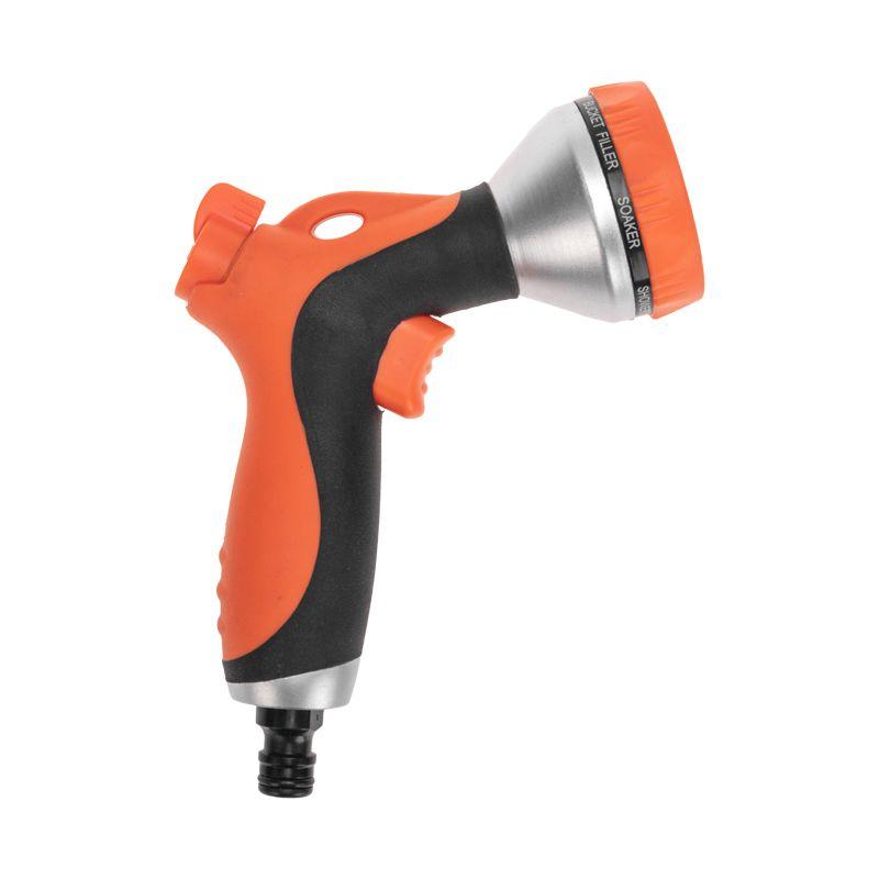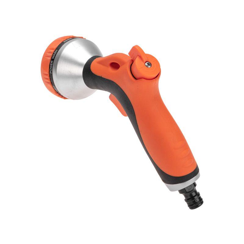 Пистолет оснащен эргономичной прорезиненной ручкой, благодаря которой его удобно и комфортно держать в руке даже на протяжении длительного времени. Имеет 7 режимов подачи воды, регулируемых поворотной головкой.