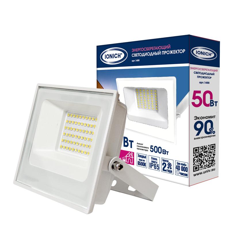 1488 | Прожектор светодиодный IFLSLED-DOB-50-865-W-IP65 50Вт 6500К IP65 4250лм бел. IONICH