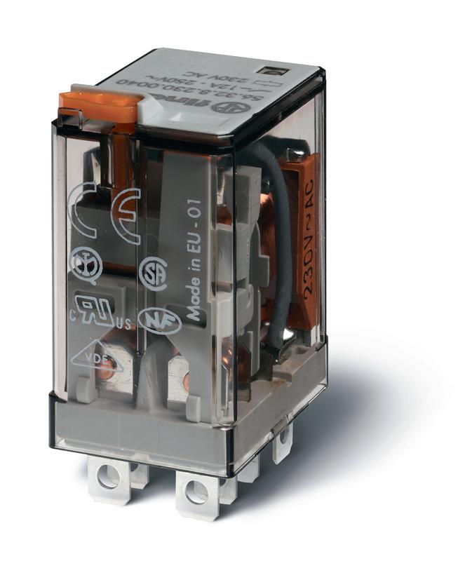 563282300040 | Реле миниатюрное силовое электромеханич. монтаж в розетку или наконечники Faston (4.8х0.5мм) 2CO 12А AgNi 230В AC RTI опции: кнопка тест + мех. индикатор FINDER