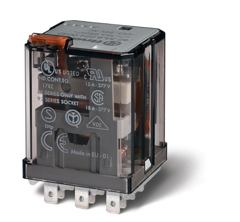 Реле силовое электромеханич. монтаж в розетку или наконечники Faston 187 (4.8х0.5мм) 3CO 16А AgCdO 12В AC RTI опции: кнопка тест + мех. индикатор FINDER 623380120040