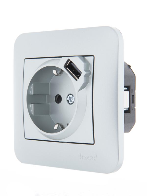 707-4388-181 | Розетка 1-м СП Karina 16А с заземл. с заряд. устройством USB механизм матов. серебр. LEZARD