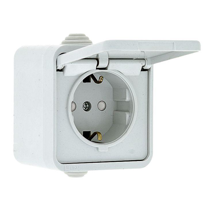 Розетка 1-м ОП Прага 16А IP44 с заземл. защ. шторки с крышкой бел. EKF EKR16-029-10-440